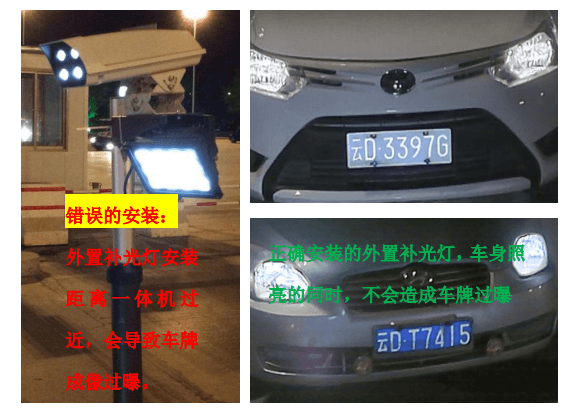 外置補光燈推薦采用白色LED補光燈,20~30W,聚光性質. 安裝高度要和攝像機保持在0.5米~0.7米的距離,外置補光燈的亮斑直接打在車牌或者車牌偏下一點,可以根據車牌過曝情況做微調,比如攝像機離地面高度1.6米,補光燈裝在同一根立柱0.9米~1.1米高; 注意:特別需要避免與以下外置補光燈錯誤的安裝情形: 外置補光燈與攝像機的安裝距離過近,如下圖,兩者的安裝距離小于30cm,補光燈的光線會直接被車牌表面的反光涂層反射到鏡頭,導致車牌在視頻圖像中過曝,顯得發白,影響 終的識別效果.